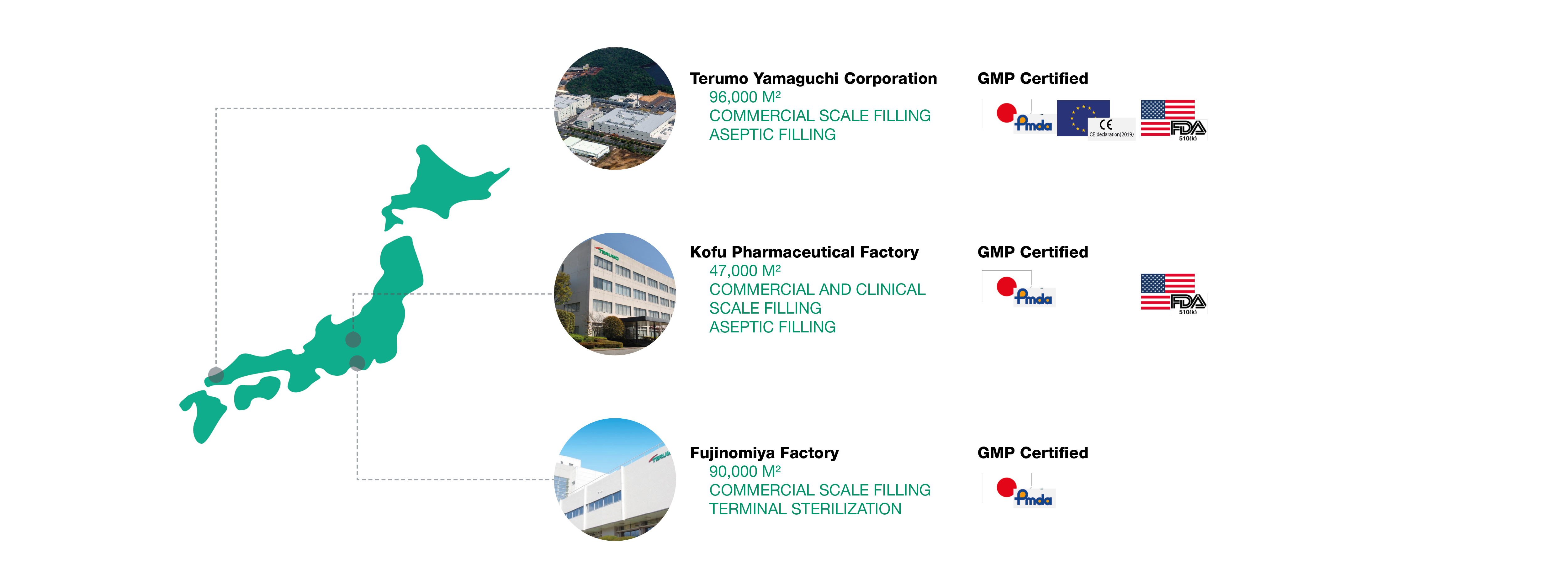 In addition to continuous improvement to production systems to more efficiently match formulation characteristics and devices, Terumo offers expanded production capacity across multiple facilities between Japan and Europe which are cGMP compliant and certified** by PMD, FDA and EMA.